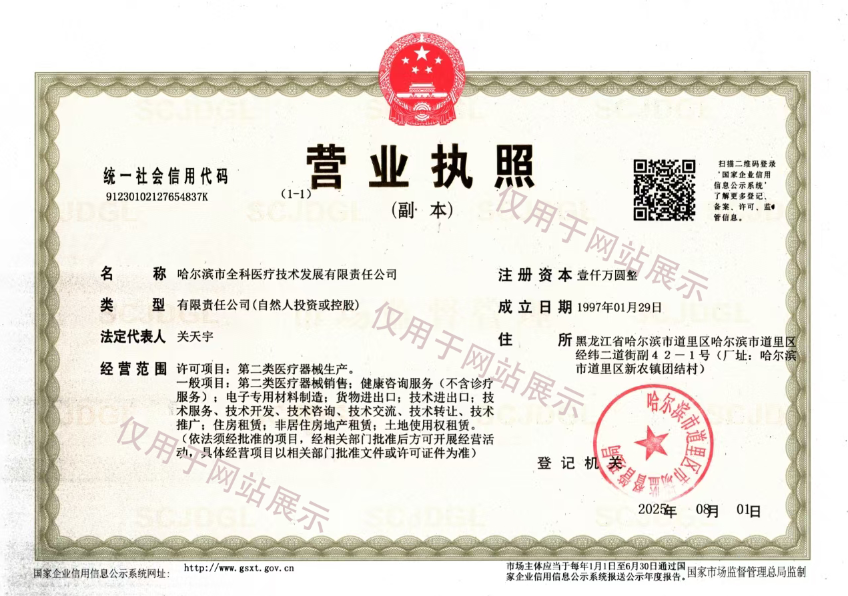 全科公司企业拥有注册资金1000万元,生产基地4万多平方米,生产车间、办公楼宇2万多平方米,公司设有生产制造厂、销售部、外贸部、网络部、科研部,还设有哈尔滨光电医疗科技开发公司、哈尔滨疑难杂症物理疗法研究所等分支机构,公司拥有一支强有力的研发生产、销售队伍,所有产品均为自主生产,有力的保证了产品质量和营销畅通。