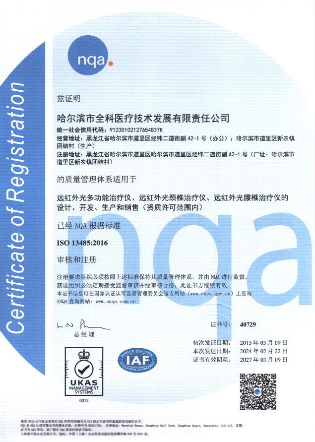 全科拥有符合FDA、KFDA标准和ISO9001与ISO13485体系的研发管理流程,由专家委员会对开发、制造过程进行控制和管理,在所有产品开发、生产过程中按照相关的国际标准进行设计,并开展全面的专项试验(包括电磁兼容EMC,安全,环境等)检测,使得产品安全性、可靠性得到充分保障。